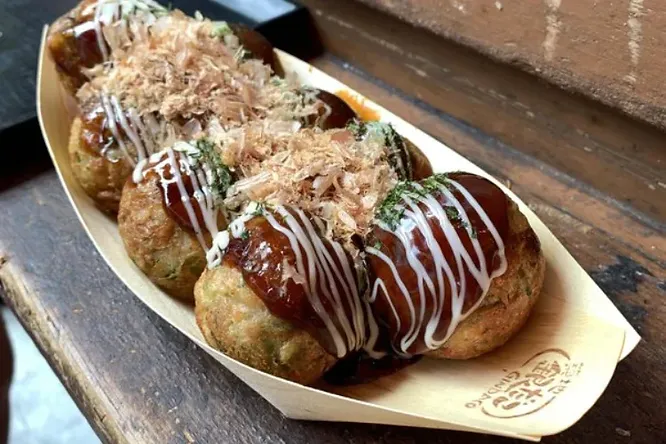 - Takoyaki – These bite-sized balls of batter filled with pieces of octopus are a must-try. They’re cooked in special molds and topped with takoyaki sauce, mayonnaise, and bonito flakes.